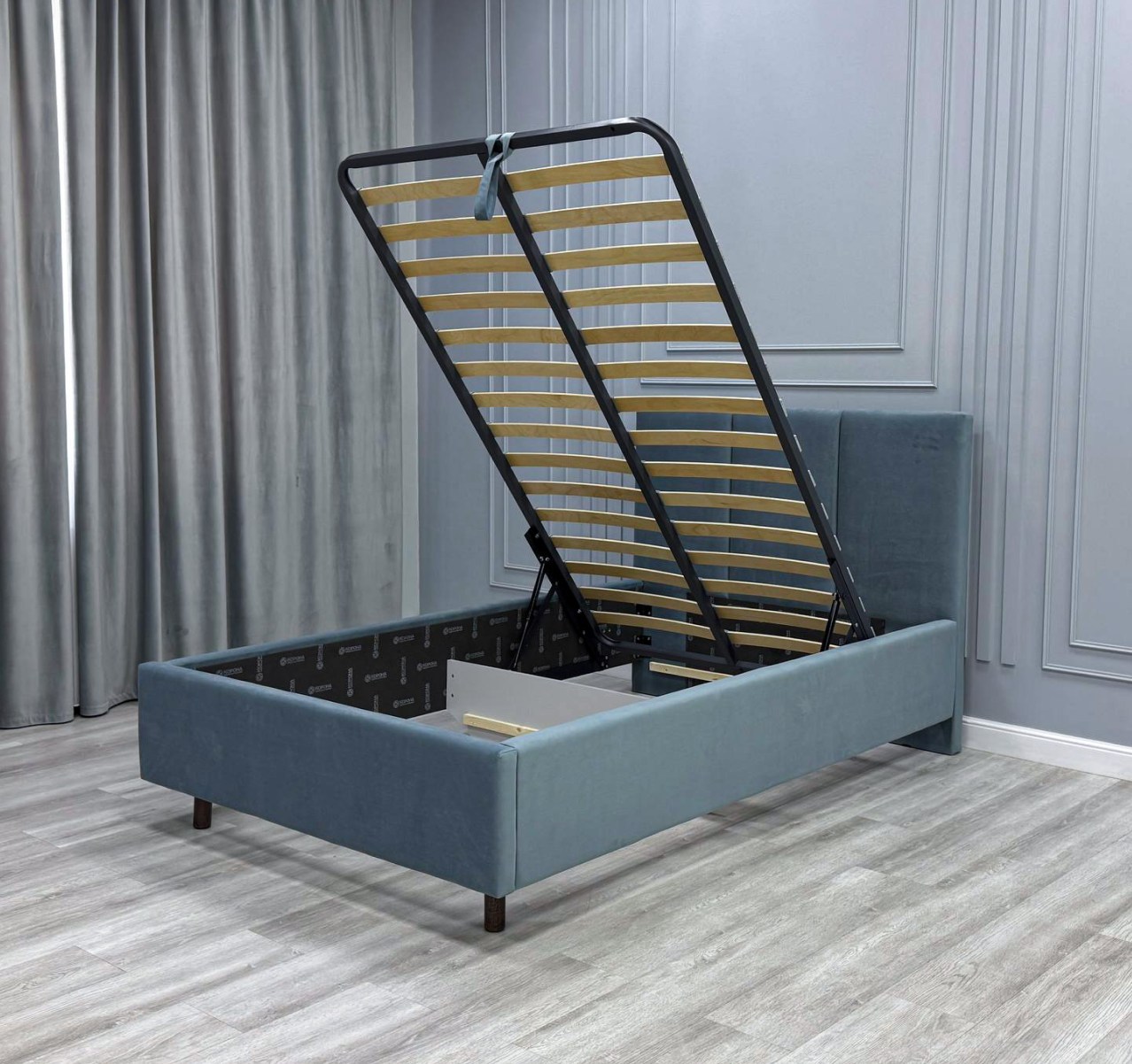 Односпальная кровать на высоких деревянных ножках в современном стиле выглядит гармонично и привлекательно. Благодаря компактным размерам она отлично подходит для комнаты подростка или молодежной спальни.