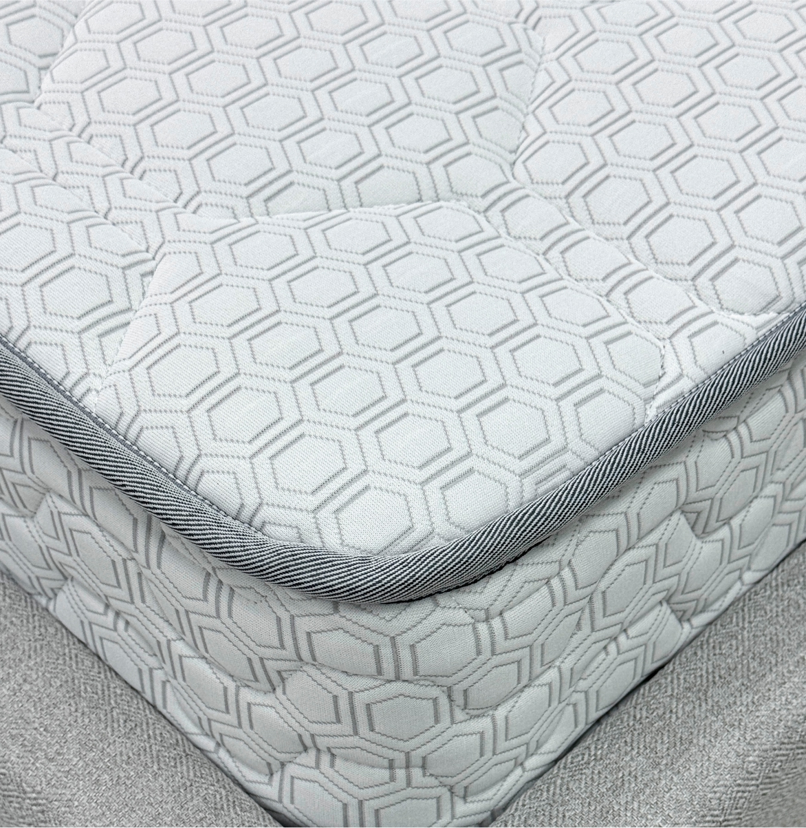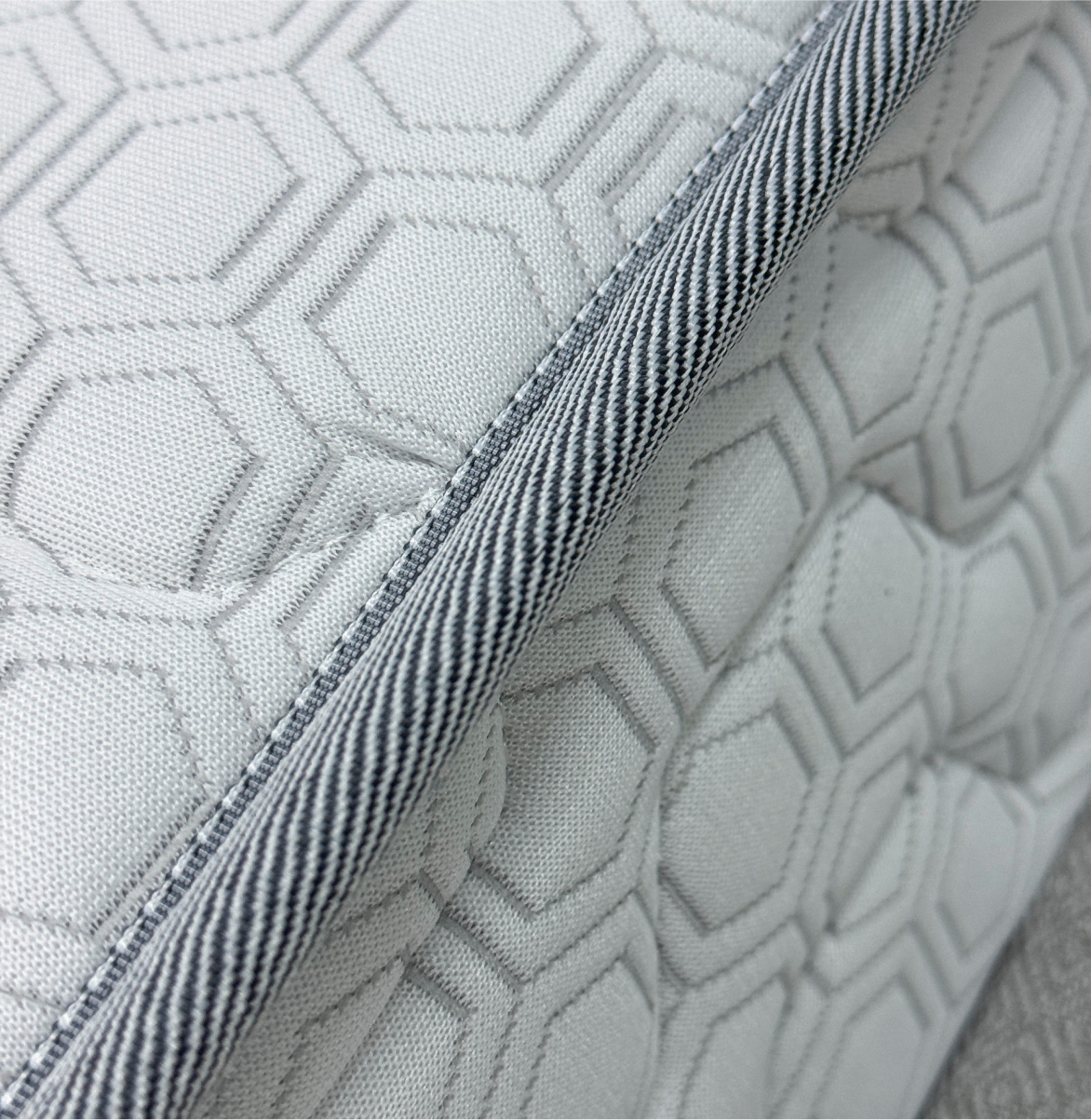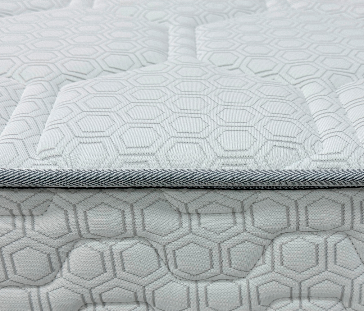 Трикотаж «Carbon» — современный и стильный материал с оригинальным рельефным рисунком «соты», который придаёт матрасу эффектный и премиальный вид. Высокая плотность ткани гарантирует её прочность и долговечность, а эластичная структура обеспечивает идеально ровное прилегание к наполнителю, сохраняя гладкость поверхности на протяжении всего срока службы. Материал обладает хорошей воздухопроницаемостью, что помогает поддерживать комфортный микроклимат во время сна, и устойчив к износу, сохраняя свой внешний вид даже при длительной эксплуатации.